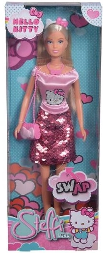 Die Steffi-Puppe Hello Kitty bietet modische Kleidung mit einem Paillettenrock und Swap-Effekt, der jeden kleinen Mode-Enthusiasten begeistert. Ebenfalls enthalten sind Accessoires wie Halskette, Stirnband und kleine Handtasche, die ihren spielerischen Charakter betonen.
