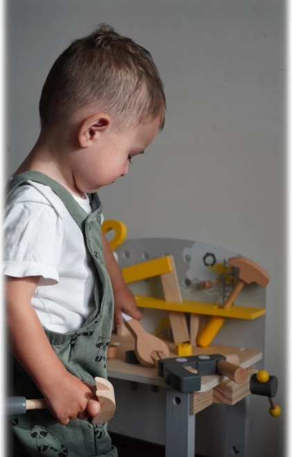Dank des realistischen Designs bietet die Werkbank Kindern die Möglichkeit, das Gefühl einer echten Werkstatt zu erleben und ihre Kreativität und motorischen Fähigkeiten zu entwickeln.