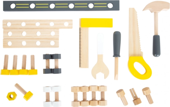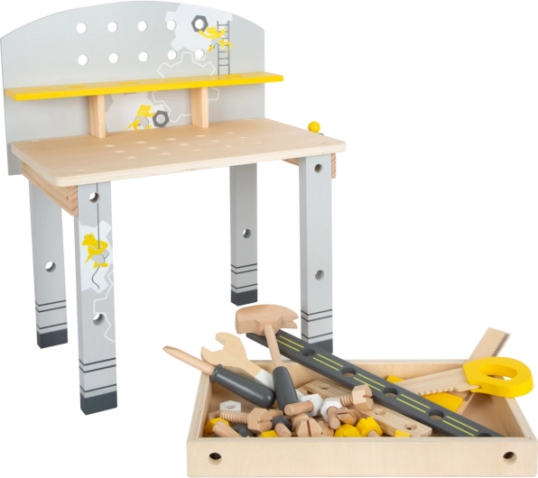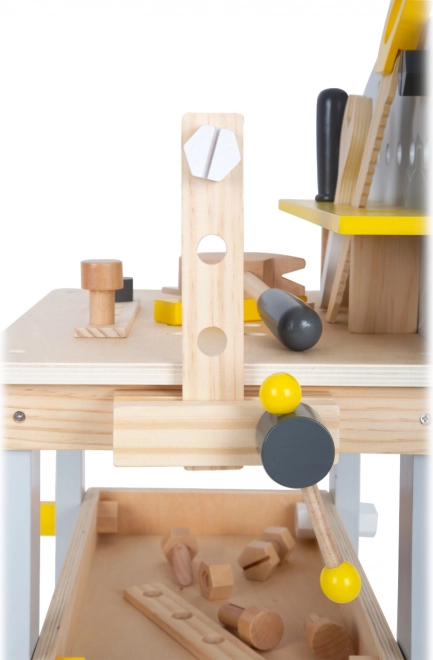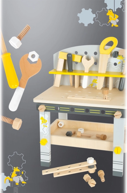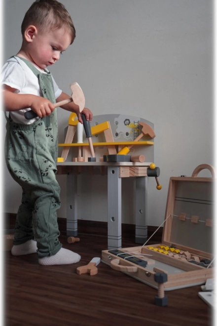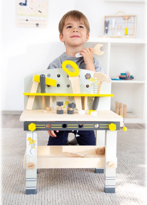 Die Werkbank enthält eine Säge, einen Schraubstock, Schraubendreher und weitere Werkzeuge, die es Kindern ermöglichen, echte Bauprojekte nachzuahmen.