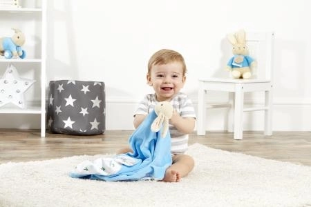 Das entzückende Schnuffeltuch mit Häschen PETER RABBIT begeistert jedes Baby. Es ist kuschelweich, angenehm zu berühren und lässt sich leicht zusammenrollen und mit einem Knopf sichern. Außen blau, innen mit Illustrationen nach Beatrix Potter verziert. Ideal als Geburtsgeschenk oder zur Taufe.