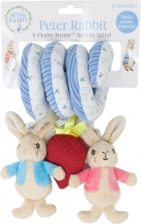 Rassel-Spirale Flopsy Bunny ist ein Plüschspielzeug, das Ihre Kinder überall unterhält. An der blau-weißen Spirale sind Hasen und eine rote Erdbeere aufgehängt, die visuelle und haptische Eindrücke bieten.