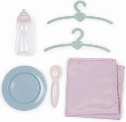 Seitliche praktische Regale erlauben es Kindern, Kleinigkeiten zu verstauen oder Puppenkleidung aufzuhängen. Das Set enthält 6 Zubehörteile einschließlich Teller, Löffel, Babyflasche und Decke. Der Koffer kann auch als Reisegepäck verwendet werden, mit klappbaren Regalen und Rollen für einfachen Transport.