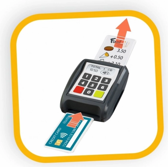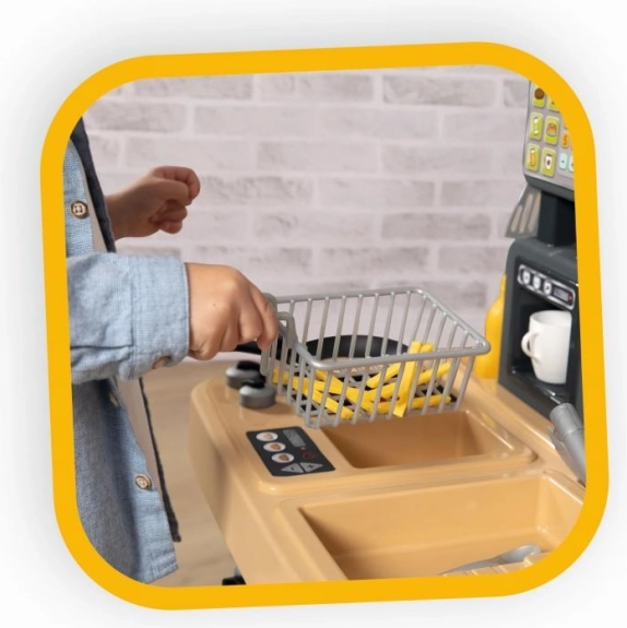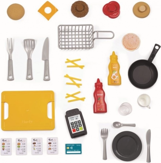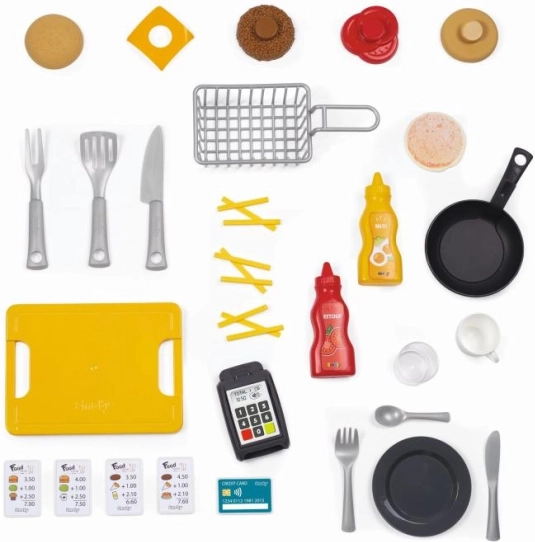 Das Set überzeugt mit vielen Details: Kochplatte, Fritteuse, Spülbecken mit Wasserhahn, Ofen, Kühlschrank, Getränkespender, Kaffeemaschine und Haken zum Aufhängen der Utensilien. Zahlungsterminal, Kassenbons, Kreditkarte sowie ein gedrucktes Menü sind ebenfalls enthalten. Nach dem Spiel lassen sich „Reste“ im Mülleimer „entsorgen“. Insgesamt 29 Accessoires unterstützen vielfältige Rollenspiel-Szenarien und die Feinmotorik.
