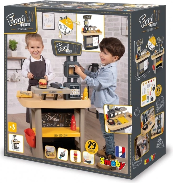 Das Kinderset Smoby Food Corner 2-in-1 verwandelt das Zimmer in ein kleines Restaurant mit Koch- und Servierbereich. Es bietet realistische Funktionen, reichhaltiges Zubehör (29 St.), Kasse mit Zahlungsterminal und Menü zur Auswahl der Gerichte – ideal zur Förderung von Fantasie, Kommunikation und Zusammenarbeit.