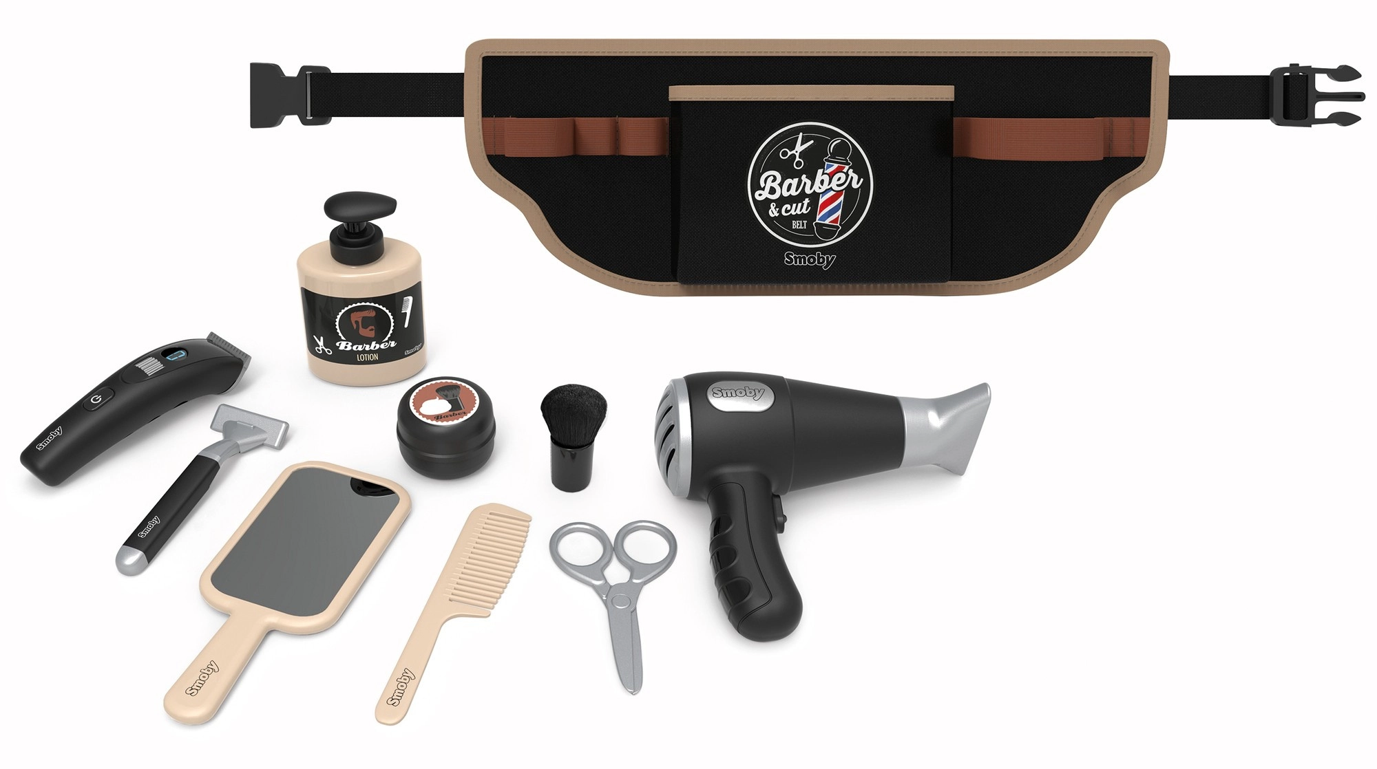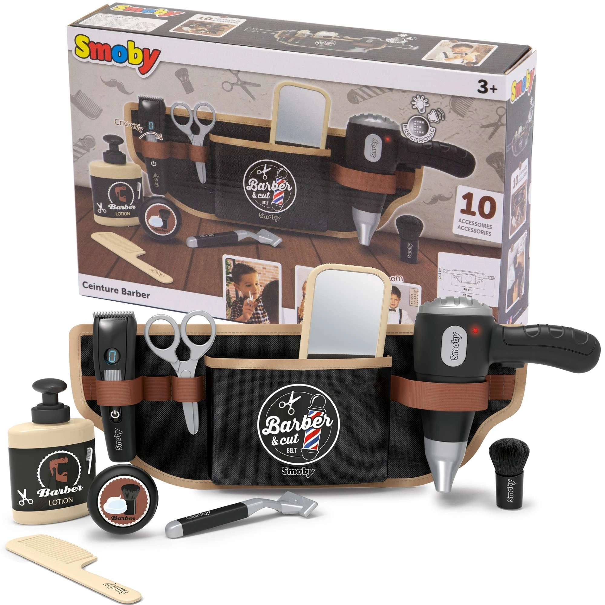 Der Friseur-Gürtel für Kinder Smoby myBeauty macht jeden Tag zu einem lustigen Salon-Abenteuer. Dank des verstellbaren Gürtels sind alle Utensilien sicher verstaut und immer zur Hand – vom Föhn über die Schere bis hin zu Kamm und Rasierer. Der interaktive Föhn erzeugt realistische Geräusche, sodass das Spiel wie echt wirkt.