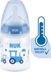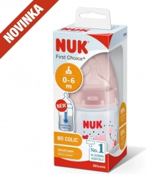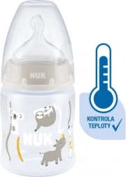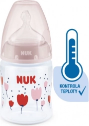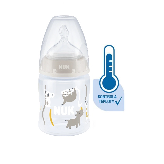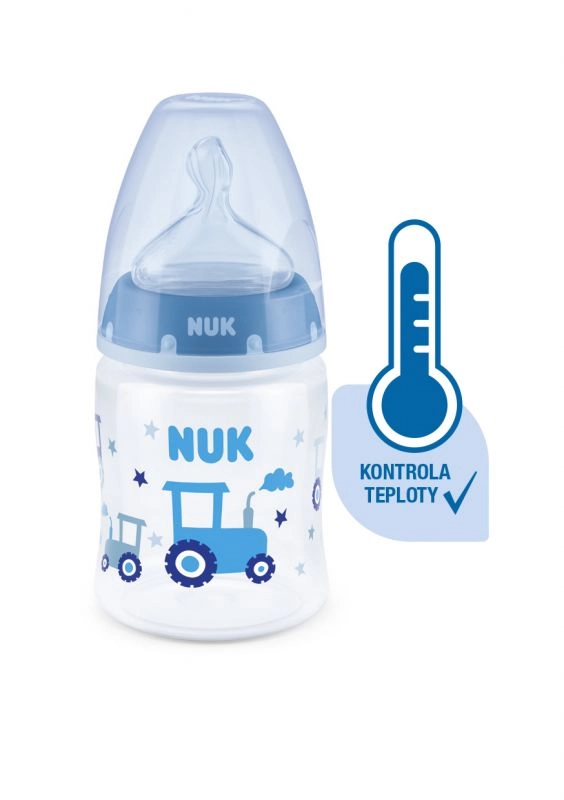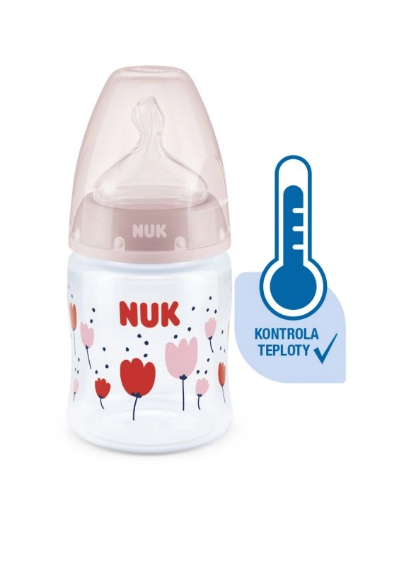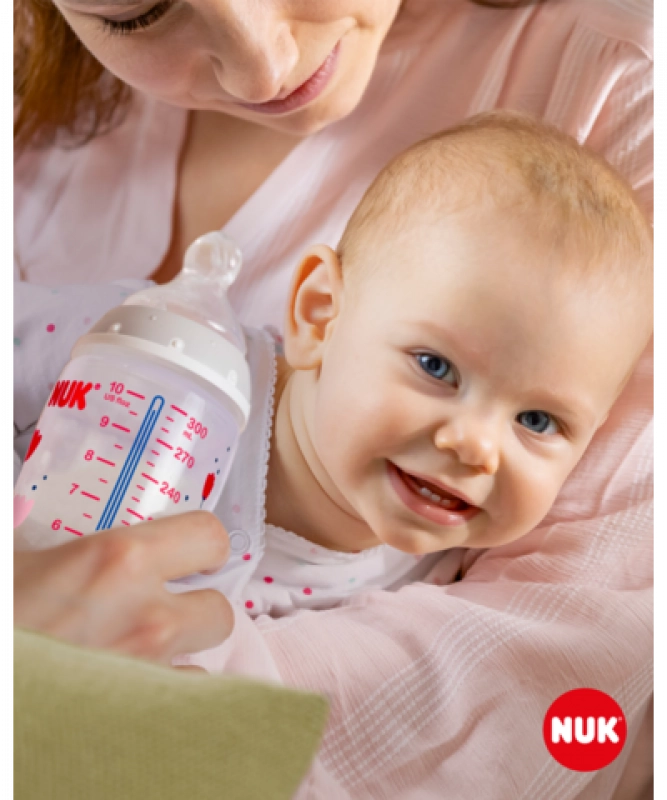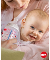 Die Temperaturkontrolle hilft Eltern, die optimale Temperatur zu erreichen und so ein sicheres Füttern ihres Kindes zu gewährleisten. Ruhiges und sicheres Füttern dank Temperaturkontrolle. Wenn das Kind hungrig ist, sollte die Nahrung in der Flasche weder zu heiß noch zu kalt sein. Deshalb prüfen Mütter und Väter vor jeder Mahlzeit die Temperatur. Es ist jedoch nicht einfach, den richtigen Zeitpunkt zu erkennen, an dem die Nahrung die passende Temperatur hat. Daher wurden die NUK First Choice+ Babyflaschen mit Temperaturkontroll-Funktion entwickelt. Diese Funktion wurde in dieser Form bisher nicht vorgestellt. Die NUK First Choice+ Babyflaschen sind jetzt mit einer neuen Temperaturanzeige ausgestattet und helfen so zu verhindern, dass Ihr Kind zu heiße Nahrung trinkt. Die Anzeige sieht aus wie ein Thermometer, befindet sich zwischen den Markierungen und ändert je nach Temperatur des Flascheninhalts ihre Farbe. Diese Funktion unterstützt Eltern dabei, die optimale Temperatur beim Füttern ihres Kindes zu erreichen. Wenn die Nahrung zu heiß ist, wechselt die blaue Anzeige zu Weiß. Im Idealfall sollte die Nahrung Körpertemperatur haben (37 °C), was dem blauen Farbton des Displays entspricht. Hinweis: Die Temperaturkontrolle ist als zusätzliche Kontrolle gedacht. Vor dem Füttern muss die Temperatur auch manuell geprüft werden. Zur Kontrolle empfehlen wir, einige Tropfen aus der Flasche auf die Innenseite des Handgelenks zu geben. Die natürlichste Saugerform für Ihr Kind. Seit vielen Jahren sind First Choice Flaschen die erste Wahl für flaschenbasiertes Füttern nach dem Vorbild des Stillens. Mit First Choice+ sind wir der Natur noch näher gekommen – sie ermöglichen eine gesunde Kieferentwicklung und vermitteln dem Kind das Gefühl, an Mamas Brust zu trinken. Natürlich und kiefergerecht geformt. Die einzigartige Form der NUK Sauger ist der Mutterbrust beim Stillen nachempfunden. Der Sauger bietet ausreichend Platz für die natürlichen Saugbewegungen von Zunge und Kiefer Ihres Kindes. So weich wie Mamas Brust. Der Silikonsauger ist dank der neuen Softzone besser an den Gaumen Ihres Kindes angepasst und sorgt so für ein natürliches Trinkgefühl. Beugt Koliken vor. Das verbesserte Anti-Kolik Air System sorgt für einen gleichmäßigen Nahrungsfluss ohne Luftschlucken. Klinisch getestet*. Dank der besonders natürlichen Saugerform werden die Sauger von Babys sehr gut akzeptiert. Das bedeutet, sie eignen sich besonders für Babys, die sowohl gestillt als auch mit der Flasche zugefüttert werden. Babyflasche. Praktische NUK Temperaturanzeige, die die Farbe je nach Temperatur von Blau (kalt) zu Weiß (zu heiß) wechselt. Frei von Schadstoffen und Gerüchen – BPA-frei. Leicht zu befüllen und zu reinigen – extra weite Flaschenöffnung. Sicherer Griff und stabile Standfestigkeit – dank ergonomisch geformter Flasche und breitem Boden. Unbegrenzte Kombinationsmöglichkeiten – kompatibel mit allen NUK First Choice Produkten. *Wissenschaftliche Studie: Moral et al., BMC Pediatrics 2010, 10:6. Weitere Informationen finden Sie unter http://nuk.com/research. Unabhängige Marktforschung mit 205 Kinderärzten, Deutschland 2018. 99 % der Mütter bestätigten, dass die NUK First Choice+ Control Flasche keine Koliken verursacht. Hauptmerkmale: Die Temperaturanzeige ändert je nach Temperatur die Farbe: Ist die Nahrung zu heiß, wechselt die blaue Anzeige zu Weiß. Ideal für den Kinderkiefer, Sauger aus besonders weichem Silikon, 0–6 Monate M (mittlere Öffnung = für Babynahrung). Klinisch getestet*: für die optimale Kombination aus Stillen und Flaschenfütterung. Attraktives Design.