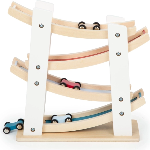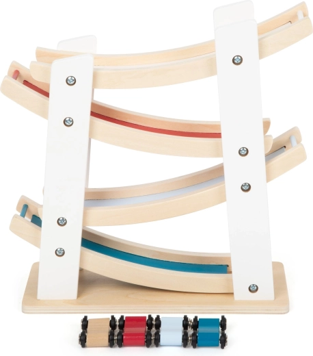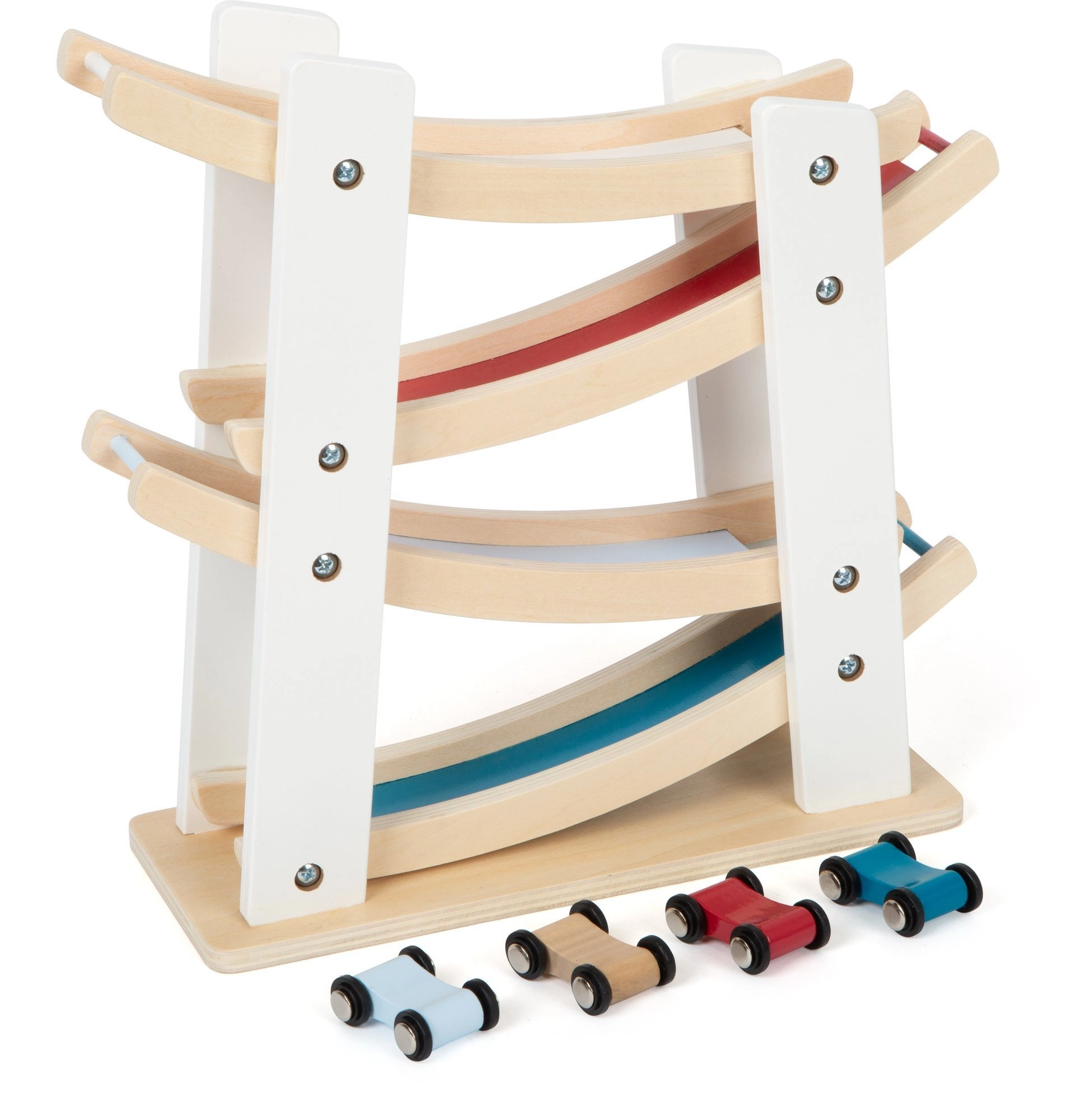 Diese hochwertige Holzbahn bietet ein einfaches Prinzip, das Kinder lieben: Legen Sie ein Auto auf die oberste Ebene und beobachten Sie, wie es schwungvoll die Kurven hinuntergleitet. Ein stabiler Stand und glatte Oberflächen gewährleisten sicheres und dauerhaftes Spielen.