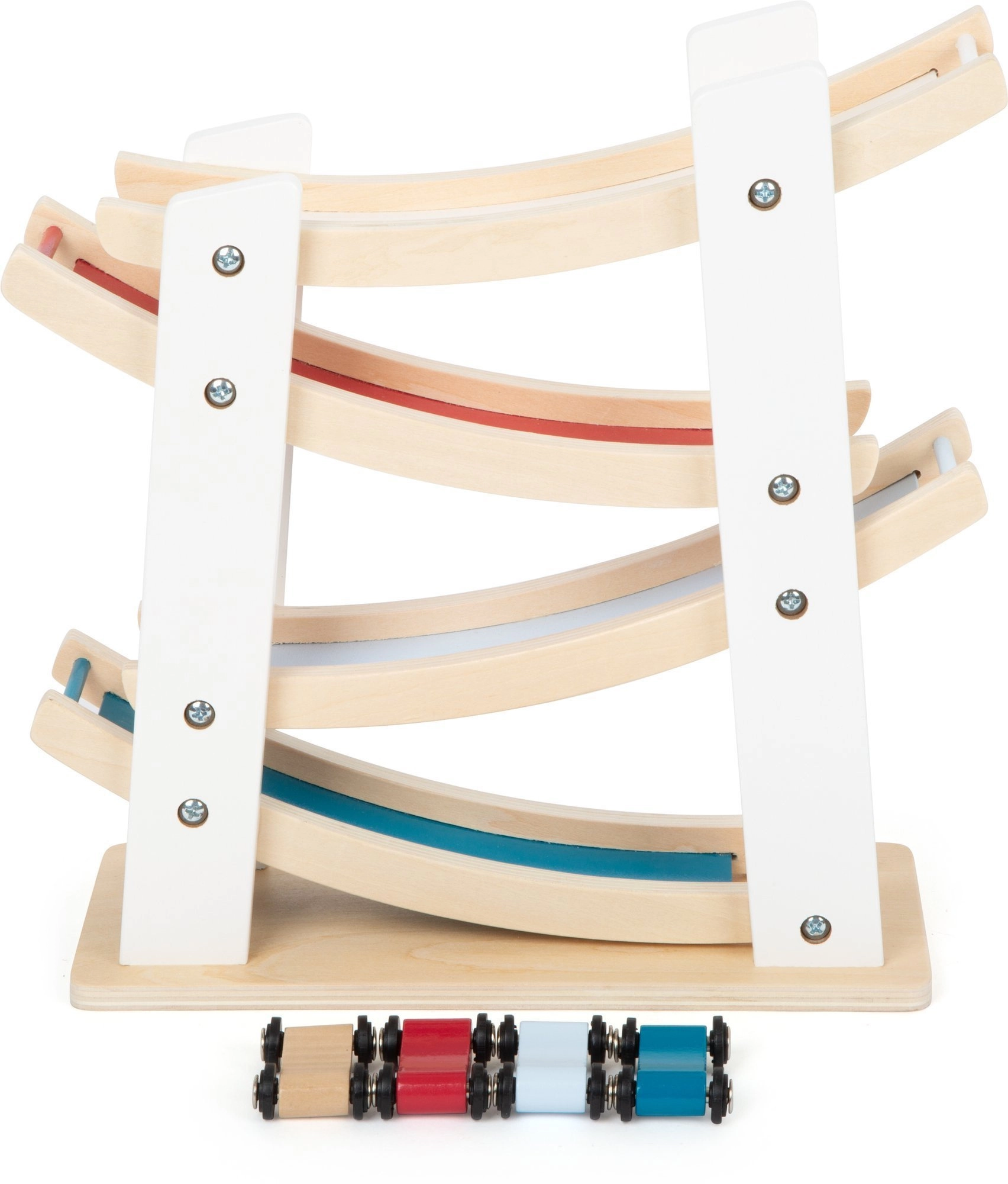 Die Autos werden oben aufgelegt und sausen geschmeidig über die einzelnen Ebenen hinab – das unterstützt das Verständnis von Ursache und Wirkung und trainiert die Koordination.