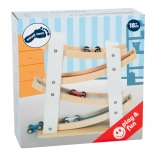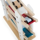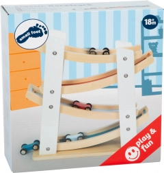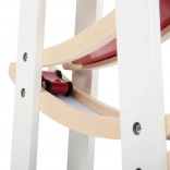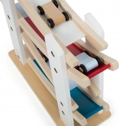 Diese schöne hölzerne Rennbahn ist ideal für kleine Rennfahrer. Dank der vier Autos, die kopfüber die Rampe hinunterflitzen können, ist das Spiel dynamisch und unterhaltsam. Aus hochwertigem Naturholz in Kombination mit farbigen Akzenten gefertigt, bietet sie eine ansprechende Optik und fördert gleichzeitig die motorische Entwicklung der Kinder.