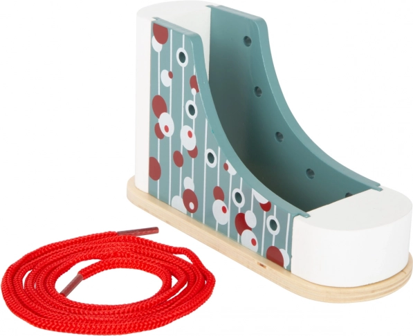 Holzspielzeug mit einem Schuhmotiv, das Kinder lehrt, wie man richtig Schnürsenkel bindet, ihre motorischen Fähigkeiten übt und viel Spaß bietet.