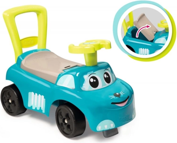 Dieser blaue Roller ist so konzipiert, dass er sichere und stabile Bewegungen für kleine Kinder bietet. Mit seinem bequemen Sitz, der über Stauraum verfügt, können Kinder Kleinigkeiten verstauen. Er ist mit einem hinteren Griff ausgestattet, den das Kind für einfachere Manöver verwenden kann. Eingebaute Sicherheitshaken verhindern ein Kippen nach vorne oder hinten.