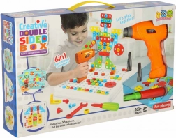 Unterhaltsames, lehrreiches Konstruktionsset für kleine Tüftler mit elektrischem Spielzeugbohrer, Schrauben und Mosaikplatte. Kinder trainieren dabei ihre Feinmotorik, Kreativität und ihr technisches Denken, wenn sie farbige Muster und eigene Konstruktionen zusammensetzen. Der praktische Koffer erleichtert den Transport und das umfangreiche Set mit 261 Teilen sorgt für stundenlangen Spielspaß.