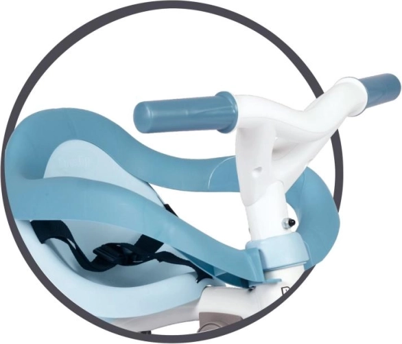 Das Dreirad beinhaltet Sicherheitsgurte und Sperrmechanismen für maximale Sicherheit und Kontrolle während der Fahrt.