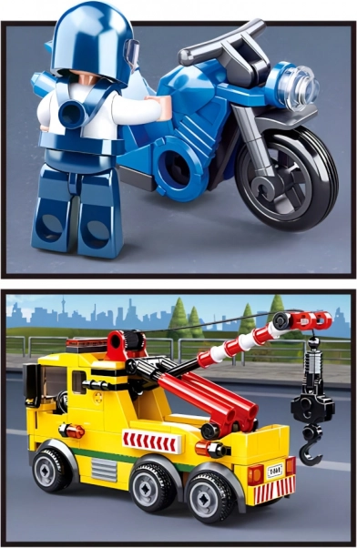 Erlebe Rettungseinsätze auf der Straße mit dem Bauset Sluban Town Abschleppwagen mit Motorrad. Dank 205 Teilen und 2 Minifiguren mit dreh- und schwenkbaren Elementen bauen Kinder mühelos einen realistischen Abschleppwagen mit funktionalem Ausleger und genießen stundenlangen kreativen Spielspaß.