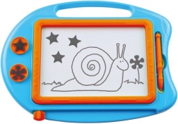 Die magnetische Fläche ermöglicht es Kindern, ohne Papier und Stifte zu zeichnen, zu schreiben und zu stempeln. Mit einem Zug wird das Bild gelöscht und es kann von Neuem gestaltet werden.