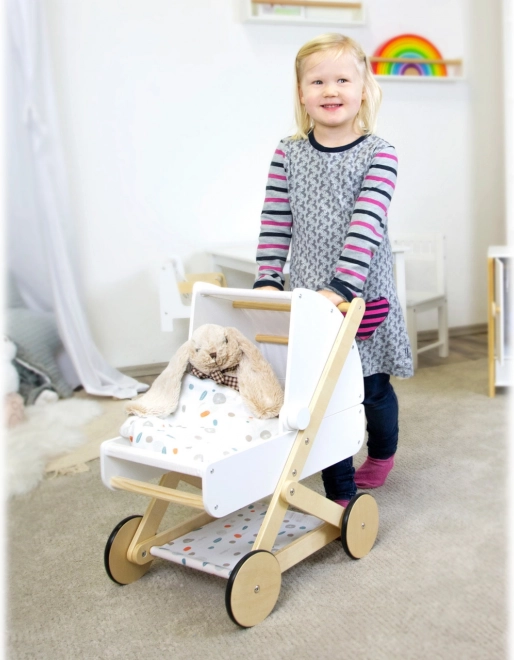 Entdecken Sie einen hochwertigen Puppenwagen, der in jedes Kinderzimmer passt. Er kombiniert naturbelassenes Holz, robuste und abwaschbare Textilien sowie eine sanfte Farbpalette. Das geringe Gewicht und die stabile Konstruktion sorgen für eine sichere Fahrt, während die gummierten Räder für leisen Lauf auf jedem Untergrund sorgen.