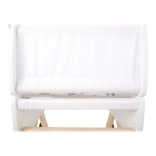 Praktischer Korb unter der Liegefläche und beidseitige, neutrale Bettwäsche mit großer Decke für Puppen bis 46 cm.