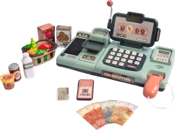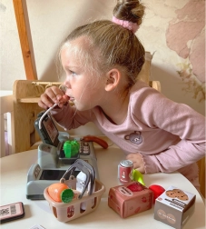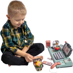 Die Kasse enthält ein Terminal, mit dem das Kind Barzahlungen, Kartenzahlungen oder Zahlungen per Smartphone durchführen kann, wie Erwachsene es im Geschäft tun. Integrierte Waage und bewegliches Band ermöglichen es dem Kind, die Einkäufe zu organisieren und die tatsächliche Rolle des Verkäufers zu erleben.