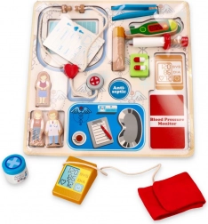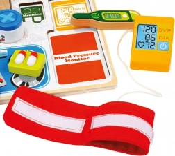 Auf spielerische Weise lernen Kinder, Stethoskop, Thermometer, Spritze und weiteres Zubehör zu erkennen und korrekt an ihren Platz einzusetzen.