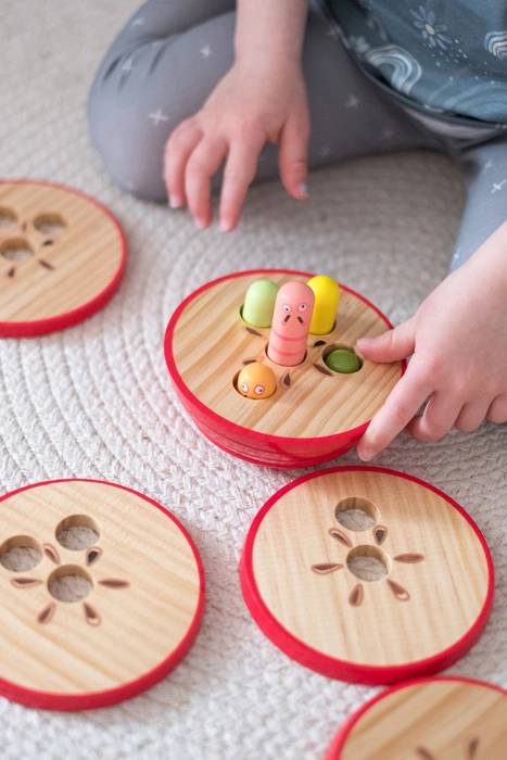 Jede Ebene hat eine andere Anzahl an Öffnungen – die Kinder legen so, dass die Anzahl der Öffnungen der Zahl der hervorschauenden Würmchen entspricht. Ein spielerischer Weg zu logischem Denken und Konzentration.