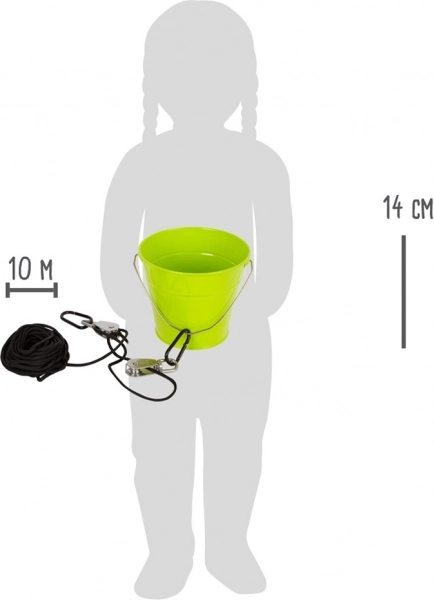 Perfekt für den Einsatz im Gartenhaus, an Klettergerüsten oder im Baumhaus. Der Metallbügel des Eimers ist so gestaltet, dass sich der Karabiner mit dem Seil nicht verschiebt, was die Stabilität und Sicherheit bei der Handhabung erhöht.