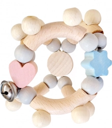 Holz-Motorik-Rassel von der Marke Hess besticht durch pastellfarbene Töne und Glöckchen, die die Vorstellungskraft fördern und die Feinmotorik des Kindes verbessern.