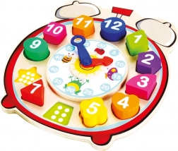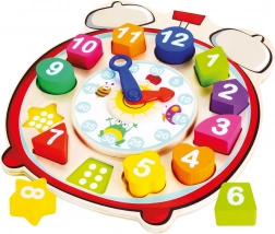 Dieses multifunktionale hölzerne Lernspielzeug verbindet eine Einlegepuzzle mit einer Uhr. Bunte Teile in verschiedenen Formen mit Zahlen werden in die entsprechenden Öffnungen eingesetzt, und unter den Teilen sind Punkte zur leichteren Orientierung und für erste Rechenübungen markiert. Drehbare Stunden- und Minutenzeiger helfen Kindern, das Prinzip der Zeitmessung auf spielerische und anschauliche Weise zu verstehen.