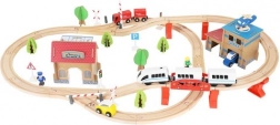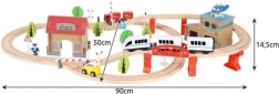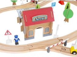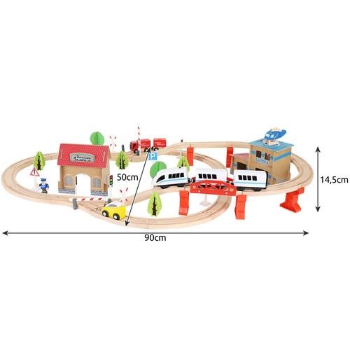 Technische Spezifikationen: - Material: Holz, PP, Eisen - Zugantrieb: 1x AA-Batterie (nicht im Lieferumfang) - Anzahl der Teile: 89 - Gesamtlänge der Schiene: 3,9 m - Schienenbreite: 4 cm - Abmessungen ausgelegt: 14,5 x 90 x 50 cm - Gewicht: 2,048 kg - Gewicht mit Verpackung: 2,506 kg