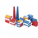 Das Bauset basiert auf dem Originalkonzept „Factory Town“ aus dem Jahr 1921. Klare Farben und reine Formen regen die kindliche Vorstellungskraft an und schulen das ästhetische Empfinden.