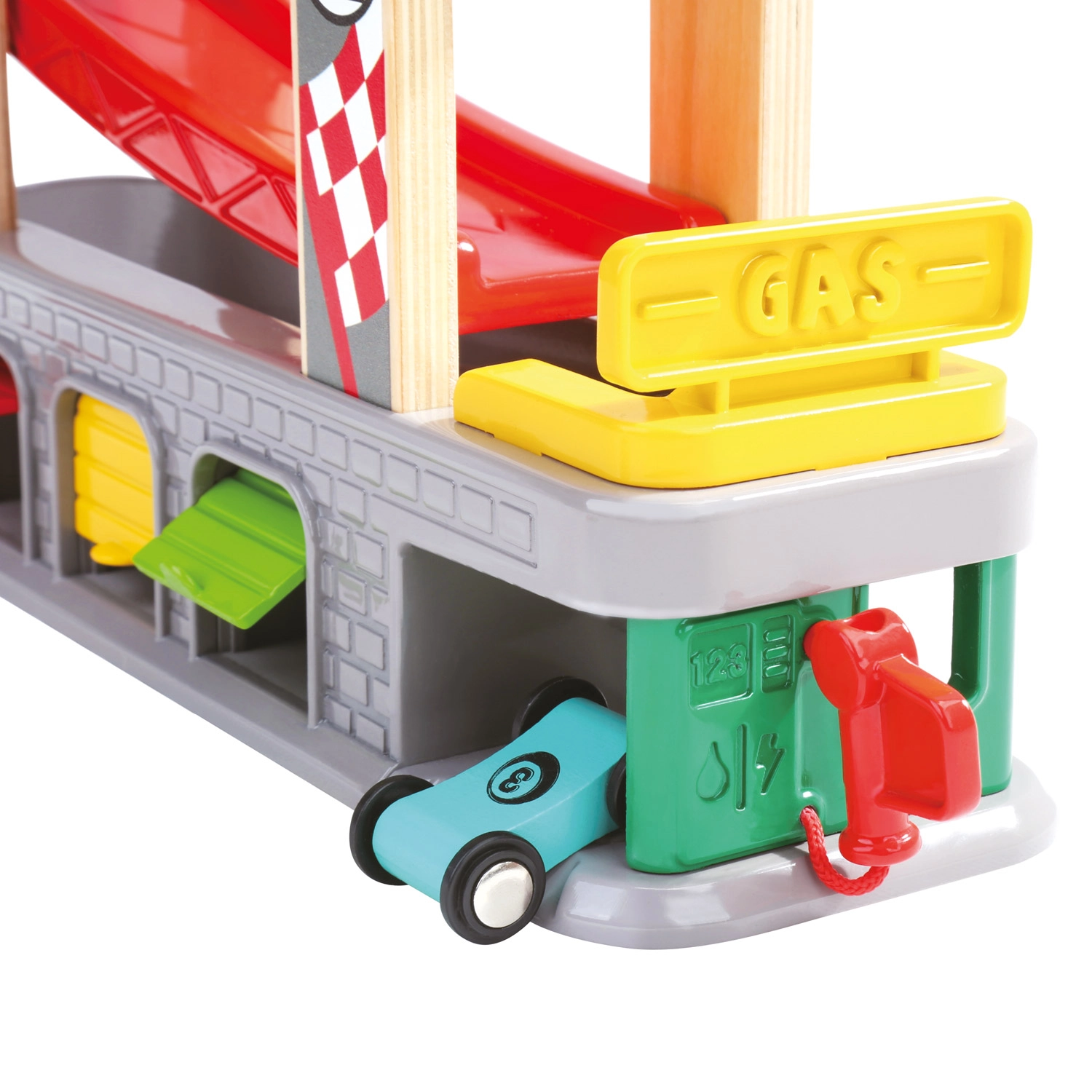 Die stabile Konstruktion aus widerstandsfähigen Materialien hält dem täglichen Spiel stand, während die praktischen Garagen auch zum Verstauen und Transport der Autos dienen. Leuchtende Farben und nummerierte Ebenen helfen beim Erkennen von Farben und beim ersten Zählen. Im Lieferumfang enthalten sind vier leichtgängig rollende Autos für sofortige Rennen.