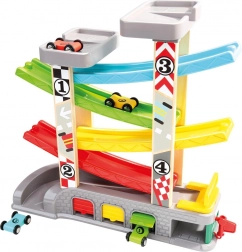 Am Fuß der Bahn befinden sich drei Garagen mit öffnenden Türen, die nicht nur als Parkplatz dienen, sondern auch als praktischer Stauraum und als Möglichkeit, das Spielzeug leicht zu transportieren. Die robuste Kombination aus Holz, Kunststoff und Metall gewährleistet eine lange Lebensdauer und sicheres Spiel, während die kräftigen Farben Aufmerksamkeit erregen und die Neugier wecken.