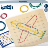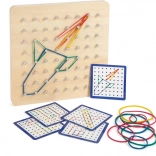 Die Geoplan-Holztafel ist mit 64 gleichmäßig verteilten Stiften auf einer festen Holzbasis von 18 x 18 x 2 cm ausgestattet. Mit 48 bunten Gummibändern können Kinder eine unendliche Anzahl von Mustern und Formen schaffen, von einfachen geometrischen Formen bis zu komplexen Kompositionen. Bestandteil des Sets sind auch 23 Musterkarten, die dabei helfen, das räumliche Planen und logisches Denken zu üben.
