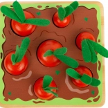 Die Inspiration aus der Montessori-Methode bietet Kindern die Möglichkeit, auf spielerische Weise zu lernen. Das Steck- und Sortierspiel arbeitet mit sieben Karotten unterschiedlicher Größen, die Kinder durch Vergleich in die richtigen Löcher im Brett stecken. Dieses Spielset hilft, feinmotorische Fähigkeiten, Größenverständnis und Beobachtungsgabe zu entwickeln. Zusätzlich fördert das realistische Design der grünen Filzteile auch Rollenspiele und die Fantasie junger Gärtner.
