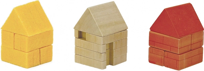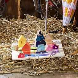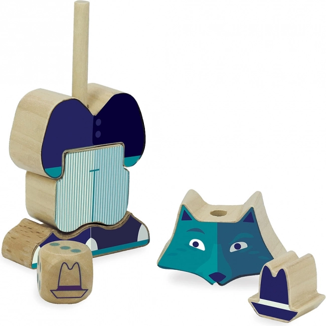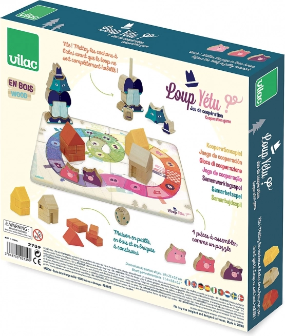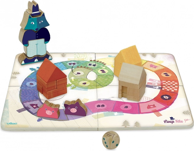 Robuste Holzteile und bunte Formen laden zum Bauen der Häuschen und zum Zusammensetzen des Wolfs ein. Kinder entwickeln spielerisch Feinmotorik und Fantasie.