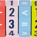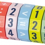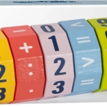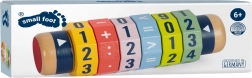 Sechs drehbare Ringe mit Zahlen und Symbolen ermöglichen das Erstellen von Aufgaben zum Addieren, Subtrahieren, Multiplizieren und Dividieren bis 99 – ein spielerischer Weg, die Grundlagen zu verstehen.