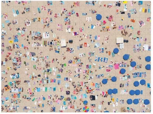 Stilvolles, beidseitiges Puzzle, inspiriert von den ikonischen Luftaufnahmen von Gray Malin, bietet eine attraktive Herausforderung und zugleich ein dekoratives Ergebnis. Eine Seite zeigt einen belebten Strand aus der Vogelperspektive, die andere die ruhige Meeresoberfläche mit Felsen und Schwimmern. Dank der unterschiedlichen Oberflächen (Glanz/Matt) erkennen Sie leicht, welche Seite Sie gerade zusammensetzen.