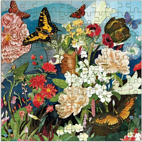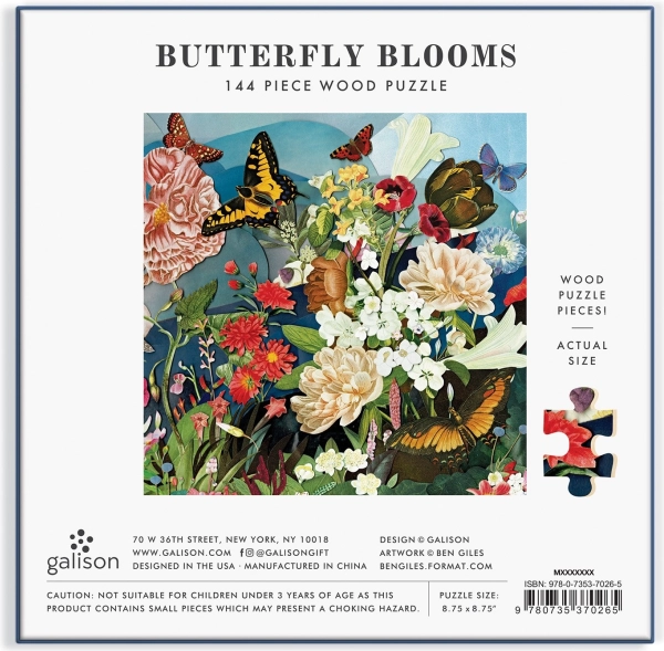Prächtiges Holzpuzzle mit wunderbaren Illustrationen von Blumen und Schmetterlingen, gestaltet vom Künstler Ben Gilles – ein großartiges Geschenk für alle Liebhaber von Kunst und Natur.