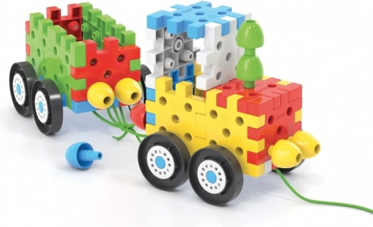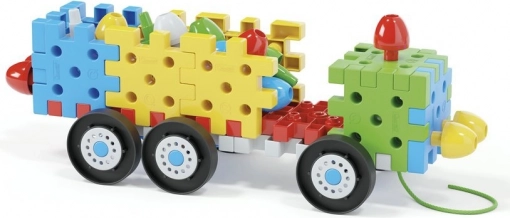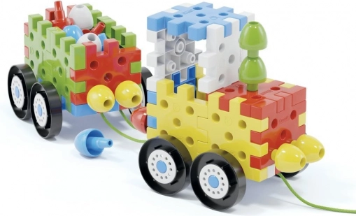 Baue aus Plättchen und Stiften Autos, Häuschen und Bäume! Dieses innovative Konstruktionsspiel enthält miteinander verbindbare flache 3D-Teile und große Stifte in verschiedenen Farben, mit denen auch kleine Kinder verschiedene Autos, Häuser, Türme, Bäume und vieles mehr zusammensetzen können. Unter den insgesamt 62 Elementen des Baukastens befinden sich auch 8 Räder für die Fahrgestelle der Autos und 3 Schnüre, an denen die Autos gezogen werden können. Neben verschiedenen Autos ermöglicht der Baukasten auch die Erstellung unterschiedlicher flacher und dreidimensionaler Strukturen. Dadurch trainiert und fördert er bei Kindern von 2 bis 6 Jahren die Feinmotorik, die Hand-Auge-Koordination sowie die räumliche Orientierung und unterstützt zugleich ihre kognitive Entwicklung. Lieferumfang: 20 miteinander verbindbare flache 3D-Teile, 16 miteinander verbindbare Stifte, 8 Räder, 3 Schnüre zum Ziehen der Autos. Hauptmerkmale: fördert Feinmotorik, Kreativität, Fantasie und logisches Kombinationsvermögen; die Verpackung enthält 52 Teile; für Kinder ab 2 Jahren