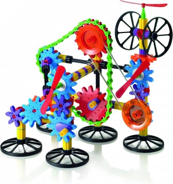 Bunte Komponenten, Stäbe, Räder und Zahnräder ermöglichen einfache wie komplexe Modelle. Der Fantasie sind keine Grenzen gesetzt.