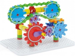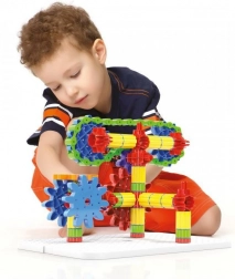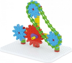Der Baukasten ist aus haltbarem Kunststoff hergestellt und für Kinder ab 5 Jahren geeignet. Er enthält Komponenten wie eine weiße Grundplatte, Zahnräder verschiedener Größen, eine Kette und vieles mehr, was es Kindern ermöglicht, die Welt der mechanischen Bewegungen zu entdecken.