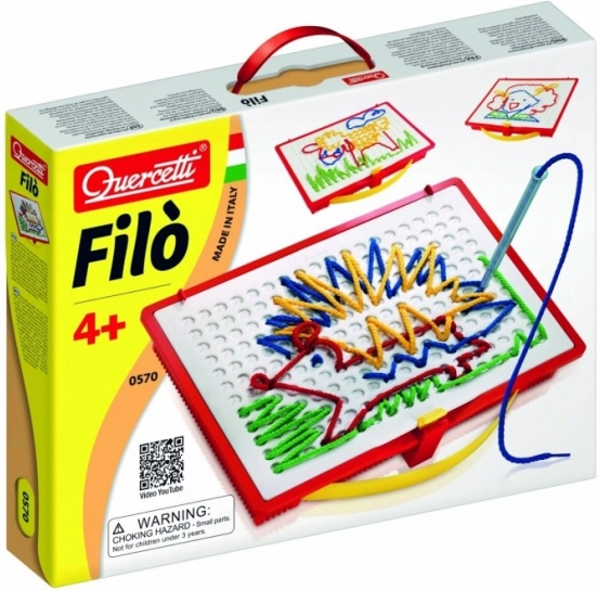 Das Stickset Quercetti Filò ist ein ideales Hilfsmittel für Kinder ab 3 Jahren und hilft, ihre Feinmotorik und Kreativität zu entwickeln. Das Set enthält 8 bunte Schnüre, spezielle Stickstifte und ein Spielbrett, das auch als Deckel des Koffers dient.
