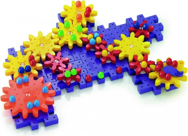 Das Set mit bunten Zahnrädern und Figuren ermöglicht es Kindern, verschiedene Strukturen zu schaffen und dabei spielerisch die Grundlagen der Mechanik zu erlernen.