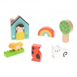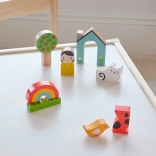 Dieses bunte Set ermöglicht es Kindern, Heimatszenen zu gestalten oder als Puzzle zu bauen. Die Teile sind so entworfen, dass sie gut in Kinderhände passen und aus 100% FSC®-Holz hergestellt sind, das umweltfreundlich ist.