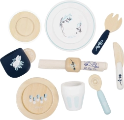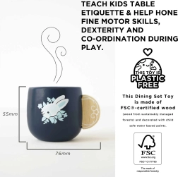 Dieses hochwertige Kinderservice ist so gestaltet, dass es lange hält und in jedem Kinderzimmer gut aussieht. Elegante blau-weiße Motive mit Pflanzenillustrationen, glatte Holzoberflächen und sichere Farben auf Wasserbasis machen es zur idealen Wahl für den täglichen Spielspaß.