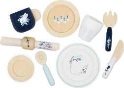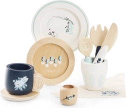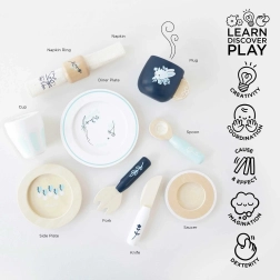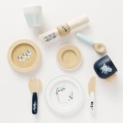 Im Set ist alles für das kleine Tischdecken enthalten: Tasse, Untertasse, Becher, 2 Teller, Messer, Gabel, Löffel und Stoffserviette mit dekorativem Ring. Beim Servieren entwickeln Kinder ihre Kreativität und Geschicklichkeit und lernen die Grundlagen des Tischkults. Ethisch hergestellt aus nachhaltigem FSC-Holz mit Fokus auf Qualität und Sicherheit.