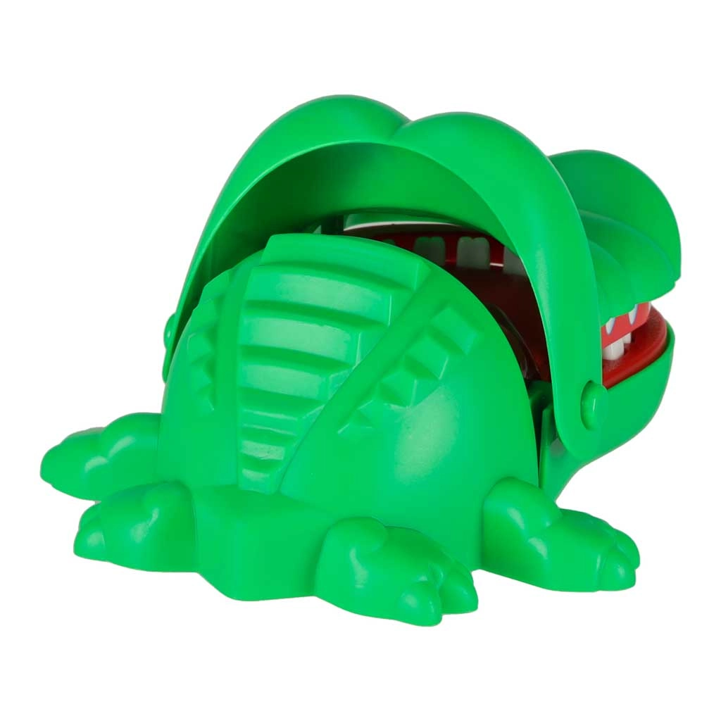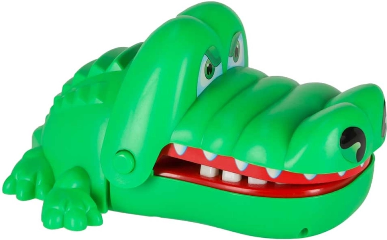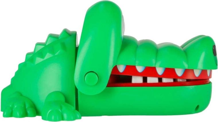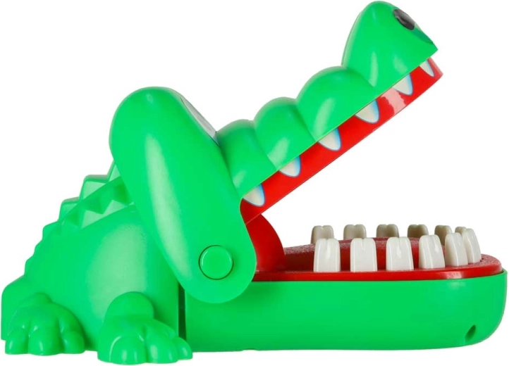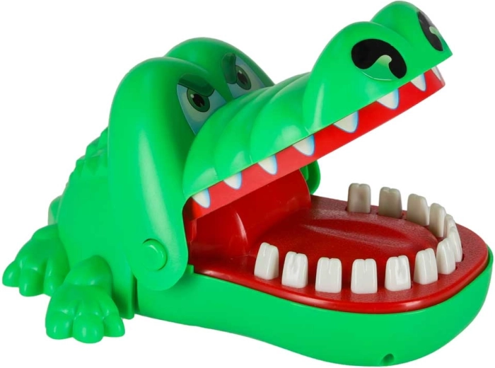 Das Geschicklichkeitsspiel mit dem Krokodil ist einfach, spannend und macht süchtig. Bei jedem Öffnen des Mauls wird zufällig ein schmerzender Zahn bestimmt, sodass man nie weiß, wann das Krokodil zuschnappt. Dank der sicheren, abgerundeten Zähne ist das Spiel auch für jüngere Kinder geeignet und fördert Reaktion und Geduld.