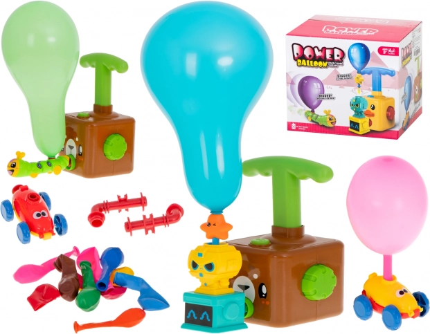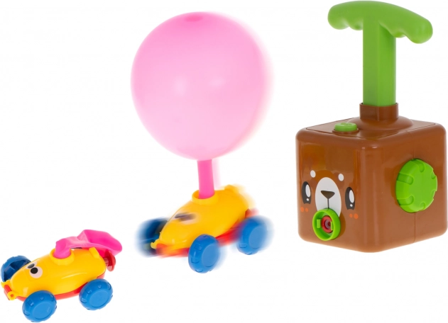 2 Autos, 12 Ballons, eine Pumpe mit Bärenmotiv und weitere fröhliche Komponenten für Wettkämpfe und Experimente.