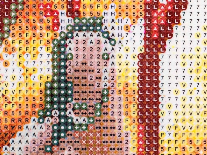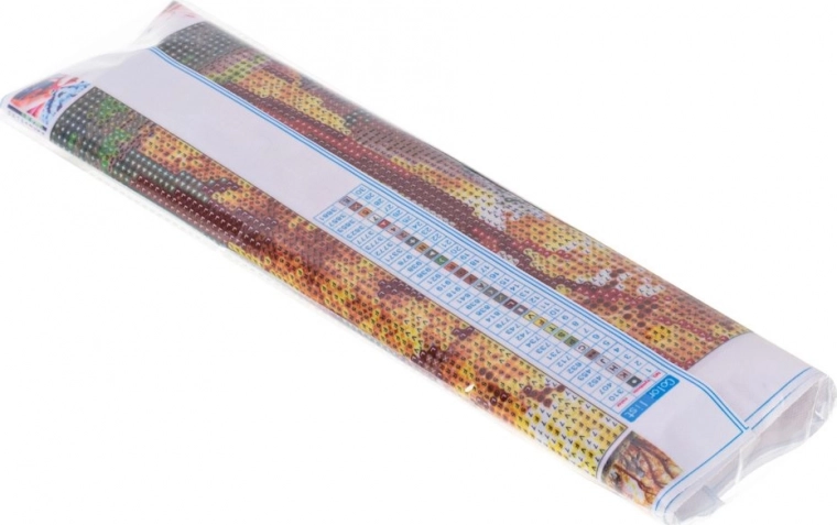 Die Leinwand ist mit einem Kleber überzogen und mit einer durchsichtigen Folie überdeckt. Entfernen Sie die Folie stückweise, während Sie die Diamanten aufkleben. Sehen Sie sich die Legende an, um zu erkennen, welcher Beutel mit Diamanten den richtigen Farbcode enthält. Streuen Sie die Diamanten in die Schale und benutzen Sie den Stift mit Wachs oder Kleber, um die Diamanten aufzunehmen und auf die Leinwand zu setzen. Wenn Sie eine Farbe fertiggestellt haben, füllen Sie die restlichen Steine zurück in den Beutel und fahren mit der nächsten Farbe fort.