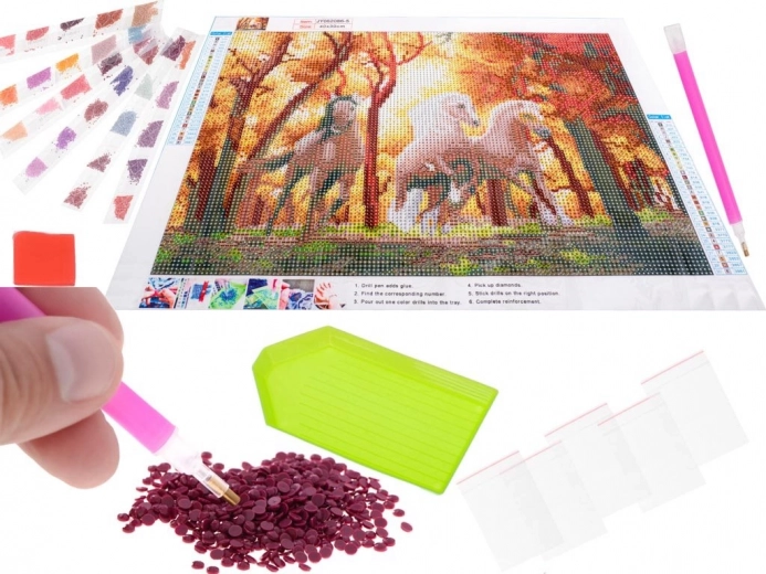 Schaffen Sie ein einzigartiges Kunstwerk mit dem Diamantmalset "Laufende Pferde". Dieses kreative Set bietet stundenlange Entspannung und eignet sich für jedes Alter. Genießen Sie die kreative Tätigkeit allein oder gemeinsam mit Familie und Freunden.