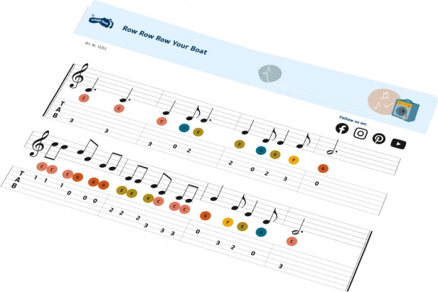 Im Lieferumfang sind einfache Noten und zwei Plektren in unterschiedlichen Größen enthalten, damit Kinder direkt nach dem Auspacken loslegen können.